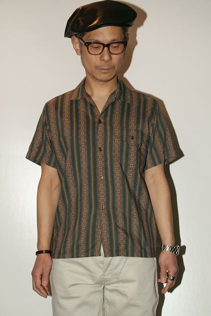 長袖同様に、国内唯一の福井県福井市のレーヨンシャトル機を使用し、1950年代頃のウエスタンシャツで実在したアラベスク(唐草)パターンを版興しし、ハワイアンシャツ同様の手捺染にて仕上げた至高のオリジナル素材になります。
