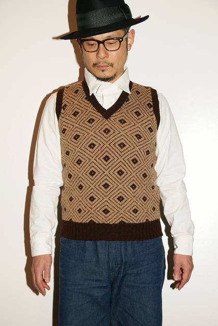 ・ADJUSTABLE COSTUME (アジャスタブルコスチューム) × JAMIESON'S (ジャミーソンズ) シェットランド・フェアアイルVネックニットベスト AK-028 ベージュ サイズ36,38